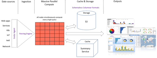 Scalyr’s agent and parsing engine parses the logs from the data sources to extract structured fields and places them in a NoSQL columnar database (either cache or storage). Columnar databases are not unique to Scalyr but they facilitate faster search and retrieval than databases that search row by row. For example, say the height, weight, age, and other bodily characteristics are the columns and the person names are the rows - with a columnar database the search can retrieve all the heights by selecting all the height column, whereas as traditional databases would search through each row to find each height. So, columnar formats are more conducive for big data analytics whereas traditional row-first databases are more suited for transactions (will need all the identifiers – ID, payment amount, date, location, etc. - of each person involved in a transaction).