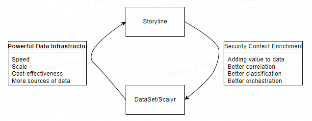 Investors might also find it interesting to consider how Storyline, mentioned in S’ managements remarks above, interacts with Scalyr (now renamed as DataSet – more on this later) to improve one another. Storyline helps SOC analysts and MSSPs/IR (Managed Security Service Providers & Incident Response Units) connect the most pertinent events so they can see the series of actions a bad actor has taken, and avoid getting bogged down in voluminous disjointed alerts (many of which will be false positives). In essence, Storyline provides context enrichment for more quicker triaging, and as we’ve depicted below, Storyline can feed back context-enriched data to DataSet, so that DataSet can refine itself and deliver even more context and faster speeds to Storyline.